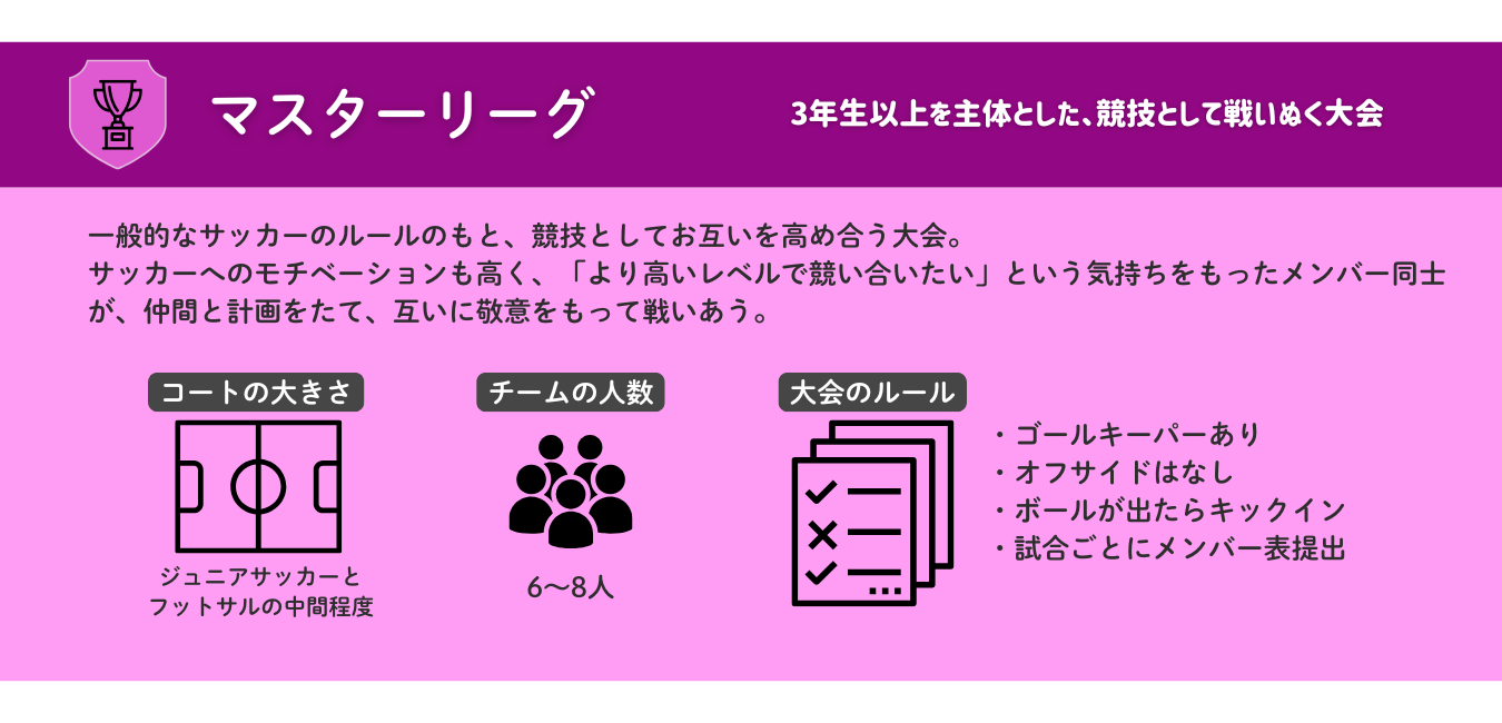 3年生以上を主体とし、競技として切磋琢磨する     ③マスターリーグ