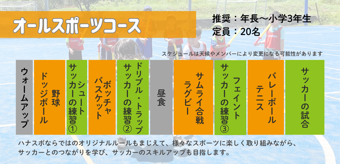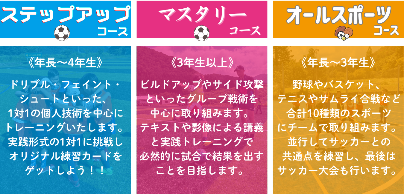 また、サッカーのトレーニングは、学年や内容を分けて2つのコースをご用意し、オールスポーツコースとあわせて、合計3種類のコースからお選びいただけます。