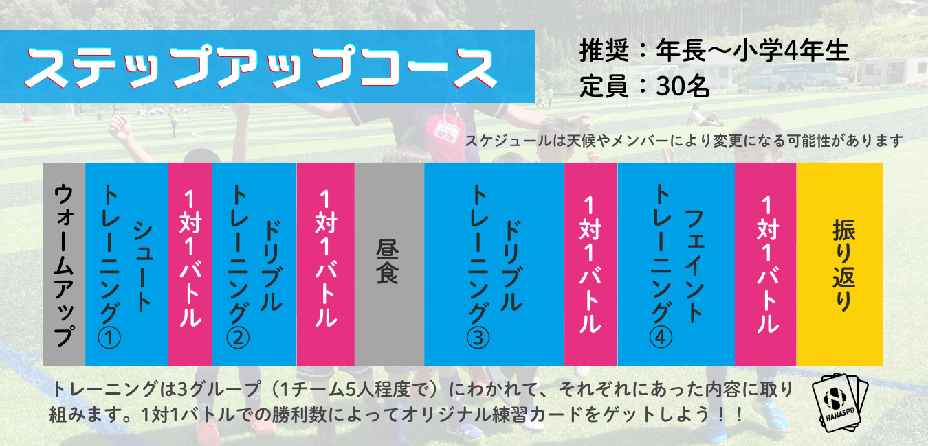 「ドリブルが上手くなりたい」「ゴールを決められるようになりたい」「試合で活躍できるようになりたい」方は1日中サッカーに打ち込むことで短期間でのレベルアップを図ります。