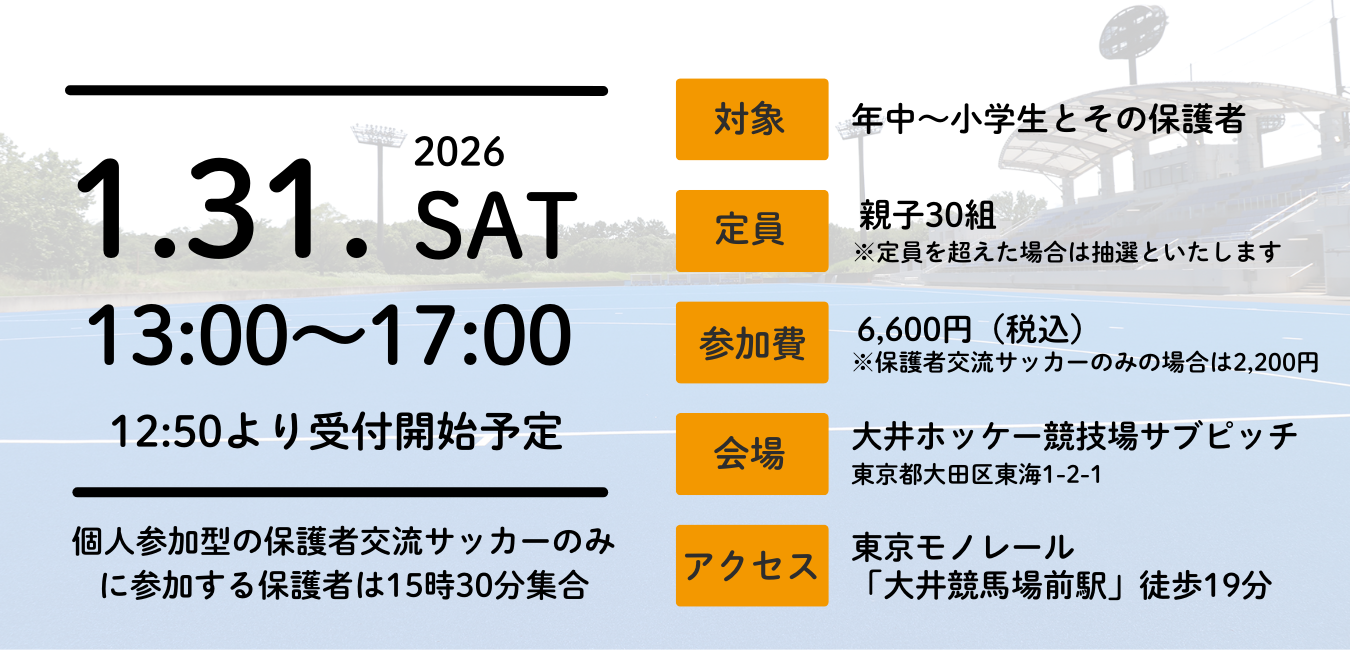 ※お子様と保護者様2名(合計3名)でのご参加も可能です(※保護者サッカー・クリニックに参加しない場合は追加料金はございません)