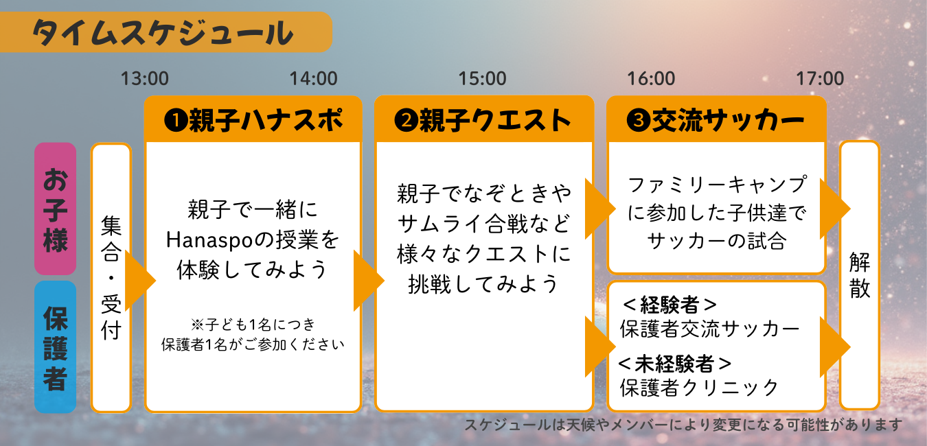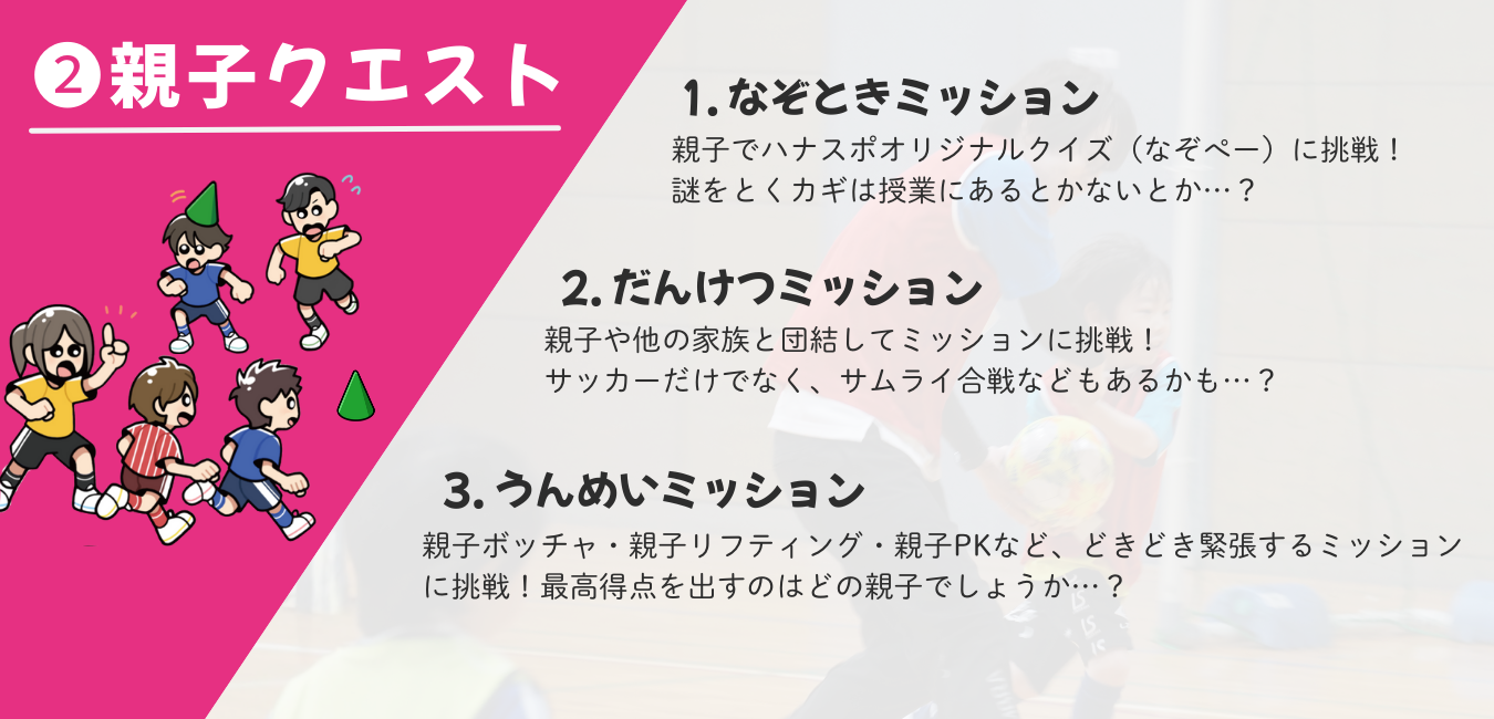 保護者さまに子どもたちと一緒にHanaspoサッカー教室の活動に参加頂くことで子どもたちの成長を一番近くで見ることを目的とした日帰りのサッカーイベントです。