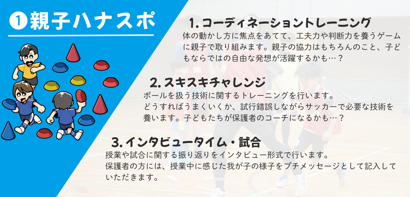 初めてサッカーボールを蹴る方や運動が苦手な方でも、ご自宅で我が子と取り組める内容ですので、帰宅後も我が子と一緒に練習可能です。