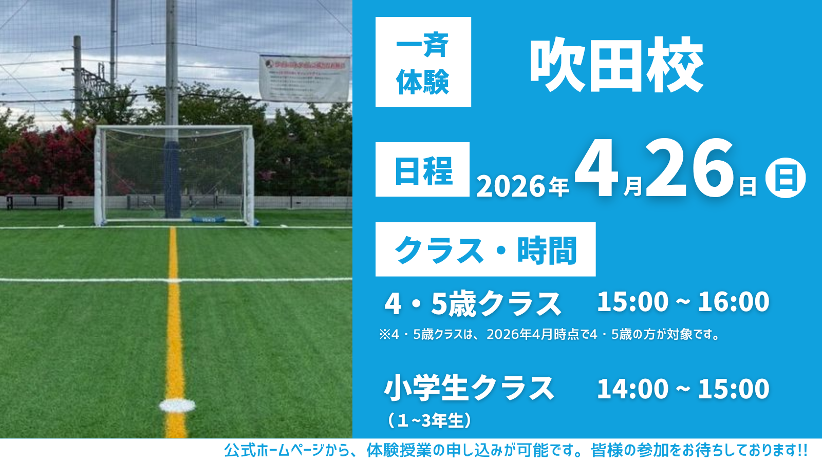 開校に伴い、4月26日に吹田校にて一斉無料体験授業を行います! 日程、クラス・時間は下記の通りです。(小阪校の体験授業については別途ご連絡いたします)